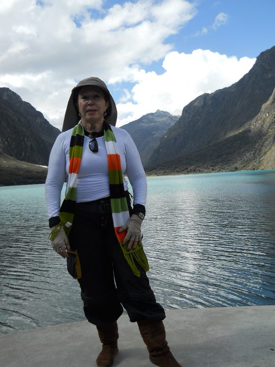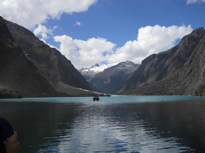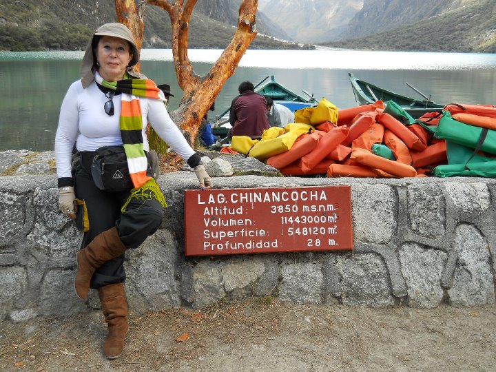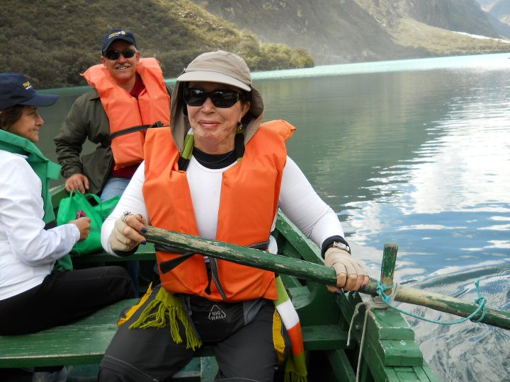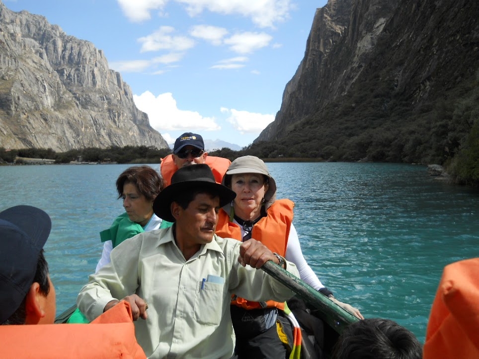 Na chegada ao Parque Nacional de Huascarán (entre Yungay e Huaraz) foi cobrada uma taxa. No sopé da montanha Huascarán, na quebrada de Llanganuco, a natureza nos oferece um grande espetáculo: como dois espelhos do céu, as lagoas Chinancocha (laguna fêmea com água de tom azul mais intenso que a laguna macho) e Orconcocha (laguna macho), coladas uma na outra, presenteiam a natureza com uma cor indefinida, ou seja, nem verde nem azul, com montanhas ao fundo. A sua beleza nos deixou encantados. Só me resta recomendar a visita ao Parque Nacional Huascarán, ou seja, as lagoas de Llanganuco, que oferecem uma experiência quase mística, pois a conexão com a natureza é plena. A água é tão fria que optei pelo passeio num barco. A sensação foi divina! No retorno, ocorreu um deslizamento de terra com abertura de uma cratera. Tivemos que retornar caminhando (um hike surpresa). Foi uma descida nada fácil, mas deparamos com uma linda paisagem: água e montanhas.
