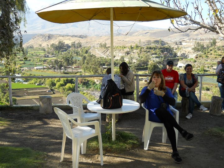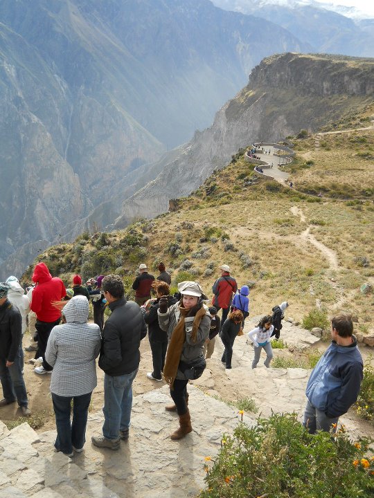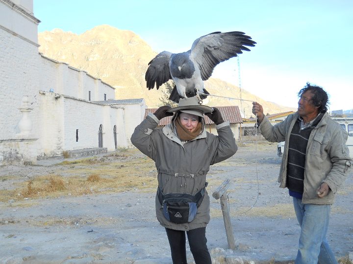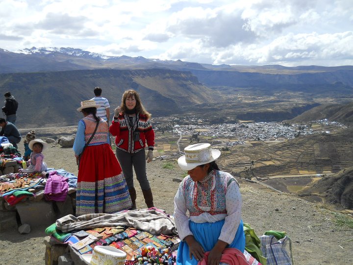 De Arequipa parti para o Distrito Chivay, localizado no sul do Peru, na região de Arequipa (a 165km), em um vale profundo, cercado por montanhas. Uma cidadezinha artesanal, onde as pessoas usam roupas coloridas. Chivay estava tão fria que, à noite, para conseguir dormir, a proprietária do Hostel colocou garrafas plásticas com água quente para aquecer as minhas pernas. Embora tenha passado uma das piores noites no Peru, devo admitir que Chivay é mágica, sendo o lugar mais visitado no sul peruano pela paisagem, ar puro e existência dos maiores pássaros do mundo, os condores. Por isto, Chivay é usada como base para visitar Canyon del Colca ou Cânion Colorado do Peru, na bacia do rio Colca, cuja profundidade é de 3.400m e 100km de extensão, um dos mais fundos do mundo, junto com o vizinho Cânion do Cotahuasi. Chegamos no mirador na hora em que os condores estavam fazendo o seu sobrevoo matinal. Lindo demais!